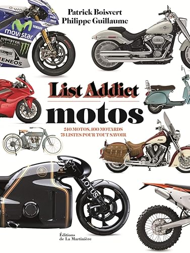 Livre : List addict motos écrit par Patrick Boisvert et ~ 75 listes inattendues, sérieuses, décalées, érudites ou drôles Pour tout savoir sur les champions, les moteurs, les records, les circuits, les marques, les innovations et les compétitions qui font de la moto un engin mythique.. 34 grands champions du monde. 4 motos qui décoiffent. 10 femmes pilotes. 5 records absurdes